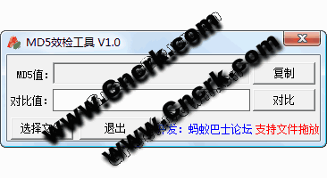一款由蚂蚁巴士论坛开发的文件md5计算、md5效检、md5对比工具,支持文件拖放,绿色精简,简单实用!