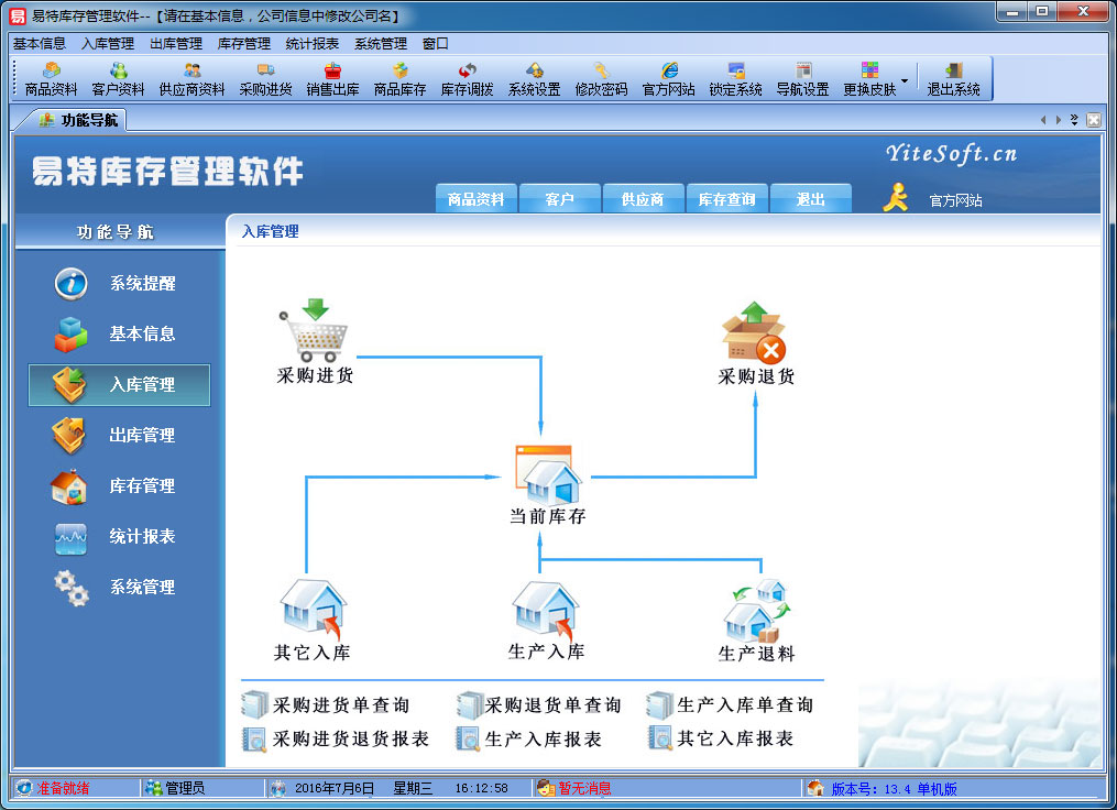 入库管理:进行货品采购入库,采购退货,生产入库,生产退料,进货单据和退货单据查询,供应商往来帐务,供应商付款。