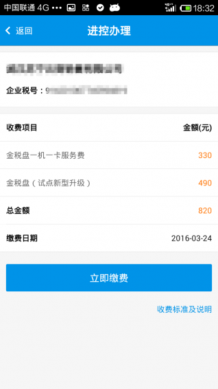 4、进控办理:营改增的新增用户,提供购买金税盘和缴纳一机一卡服务费的缴费服务