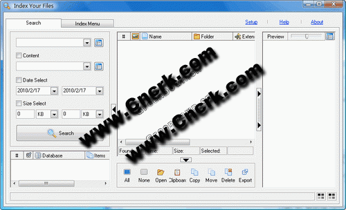 Index Your Files V5.0.0.7 英文绿色免费版 为指定的路径建立索引,从而可以快速搜索到你的目标文件。主要功能:建立索引速度快。缩到系统托盘。 可以自动更新索引。建立多个数据库文件。搜索结果有丰富的文件操作:全选;全不选;打开目录;拷贝、复制、删除文件;导出到剪贴板或EXCEL。可以选择要搜索的数据库。