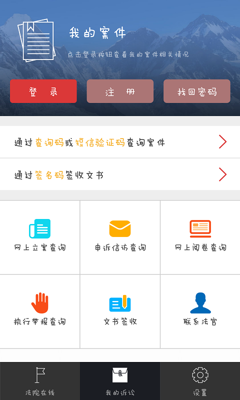 应用实现了与法院司法信息库无缝对接,为社会公众及诉讼参与人提供法院公告、法院指引、诉讼指南、裁判文书、执行信息等司法公开和司法信息查询服务,同时为诉讼参与人提供案件查询、网上立案预约、网上阅卷、电子文书送达、联系法官等便民诉讼服务。