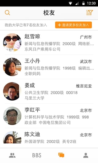2、校友BBS:和校友交流招聘、创业、聚会、婚恋、职场等话题;