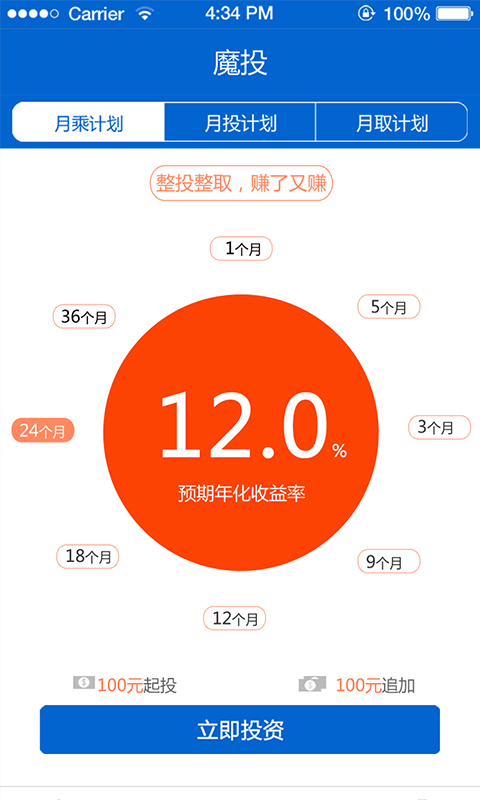 我们选择底边栏的“魔投”进入后,你只要选择魔投中的月乘计划还是月取计划,再按照自己想投资的期限选择1至24个月即可,有没有发现过往过往收益率一目了然,从8%-13%不等。选择好后点立即投资,输入金额点击确认投资即可完成投资了。如果账户中没有钱,可以选择“去充值”就可以了。