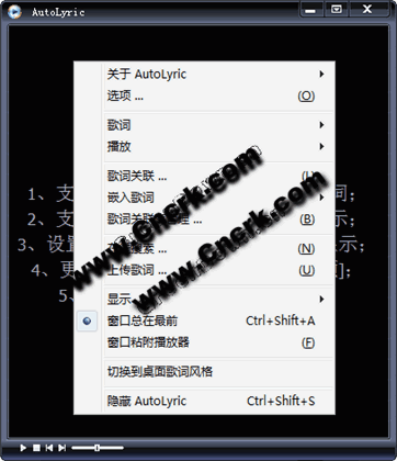 4)窗口总在最前面或者粘附播放器或者完全嵌入播放器界面,可以半透明,鼠标可点击透明;