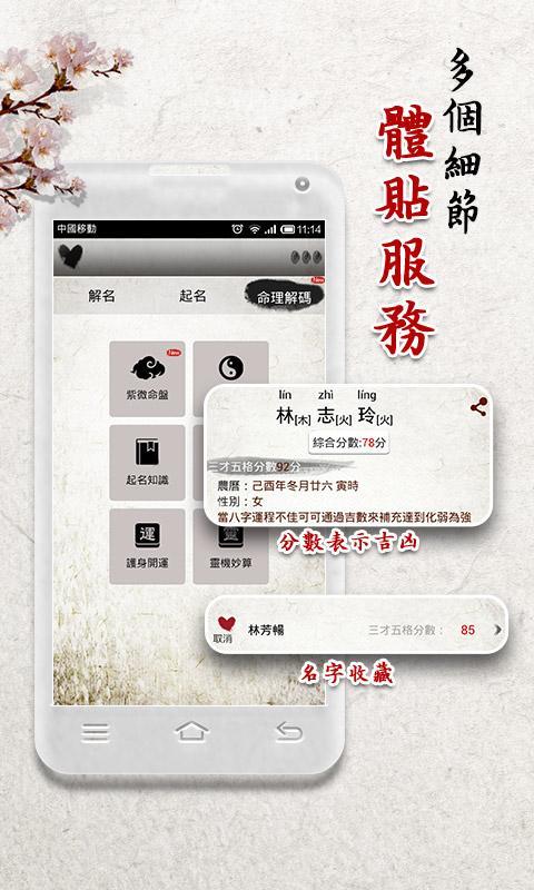 1、起名方法继承传统命理起名学优点,准确判断名字好坏!2、时间采用真太阳时,分析八字信息更加准确!