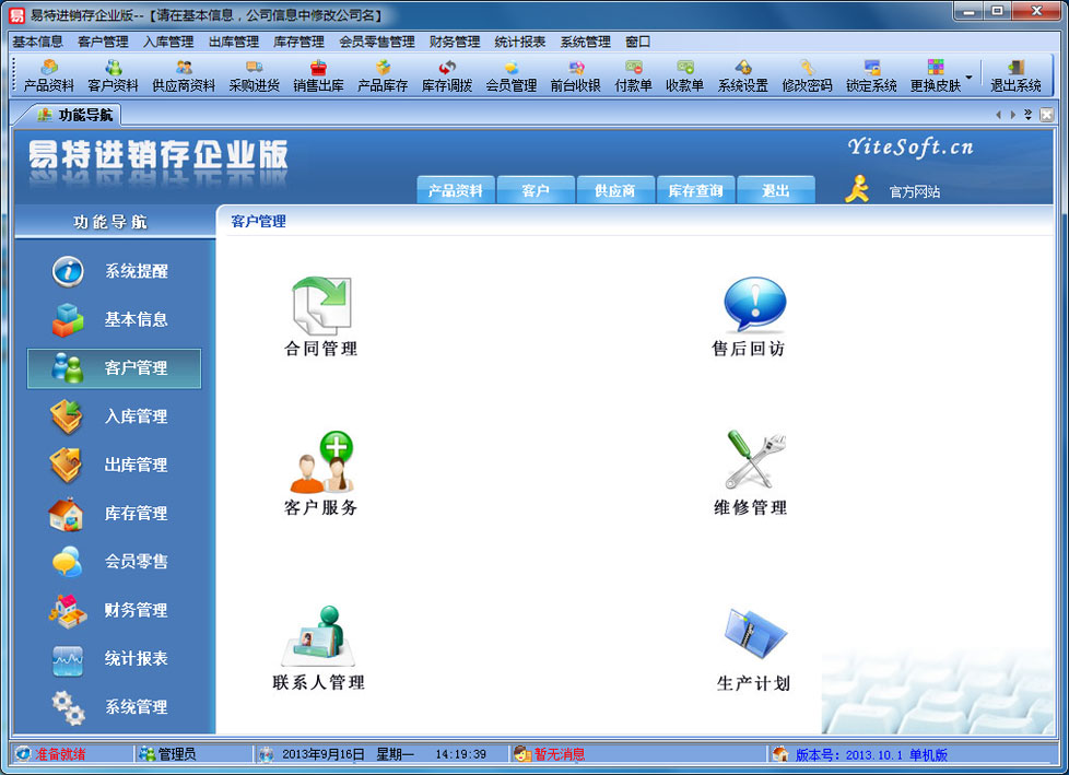 易特进销存企业版是一款专业的进销存管理软件,其中包含商品销售管理系统 ,库存管理系统(仓库管理系统),财务和报表系统等子模块。软件界面设计简洁,美观,其人性化的软件流程,使普通用户不需培训也能很快掌握软件操作使用方法,上手极易。强大报表与集成查询功能是本软件的最大特色,所有功能在用户需要的使用地方自然体现,不用打开多个窗口重复查询。易特进销存软件广泛适用于企业,商贸公司,个体门店等用于商业销售管理, 库存管理,财务管理等,客户管理,员工管理等场合,是您企业进行信息化管理的强大工具。