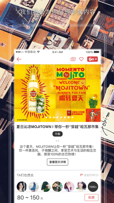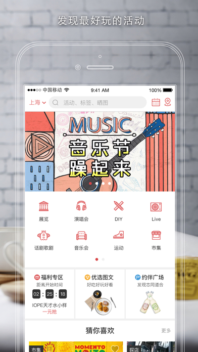 2016年最潮流的周末同城吃喝玩乐聚会交友神器,好看又会玩的人都已经下载。我们帮你发现城市当下最in的玩法——派对、演出、DIY体验、展览、集市、下午茶、徒步穿越、周末度假、摄影拍照、骑行、露营、冲浪、攀岩、划船、潜水、市集、音乐节、演唱会、咖啡馆、霸王餐、试吃团,总有一样能让你欢乐一整天!