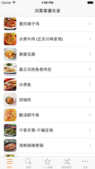 川菜菜谱大全app为您提供上千份川菜菜谱,让您乐个不停。川菜菜谱大全app提供川菜制作的详细图片和步骤。