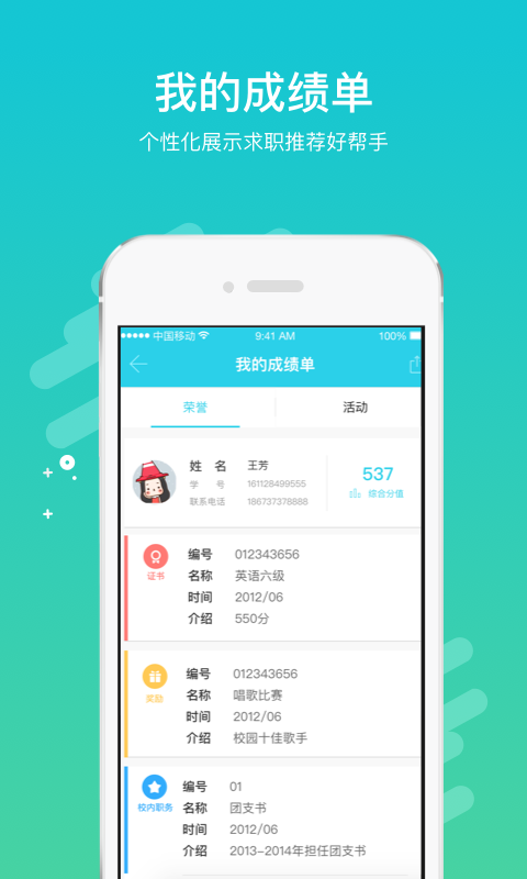 4、成绩单根据参与的活动生成第二成绩单,个性化展示全面的自己。