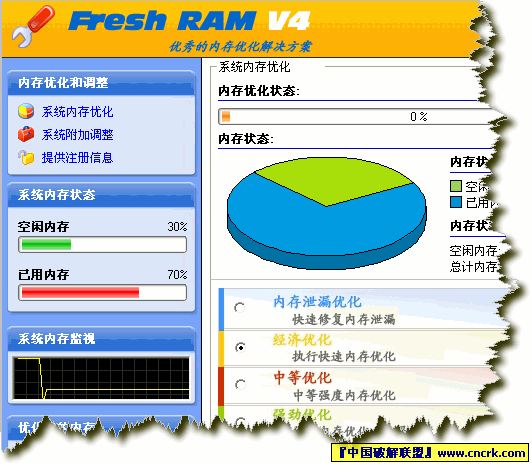 Fresh RAM V4.0 汉化版 『超顶级的内存优化整理工具』 界面友好的内存整理工具!Fresh Ram 的任务就是最大限度的释放你安装的物理内存的效率,从而让你有更多的空闲内存给系统,应用程序或者你的游戏。更多的空闲内存将让你体验到更佳的性能和稳定性。其独有的优化引擎使其变得很强悍。