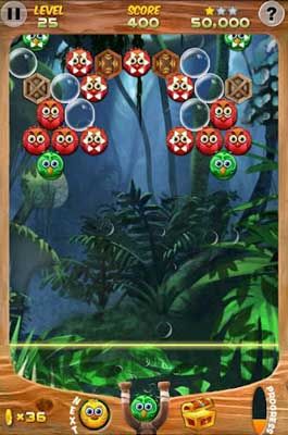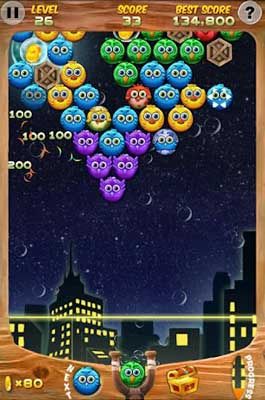 【游戏玩法】三只或三只以上同种颜色的小鸟聚在一起就会被消除掉!与市面上的泡泡龙游戏不同的是,只要玩家击打到最后的房屋泡泡即可过关,不必全消。