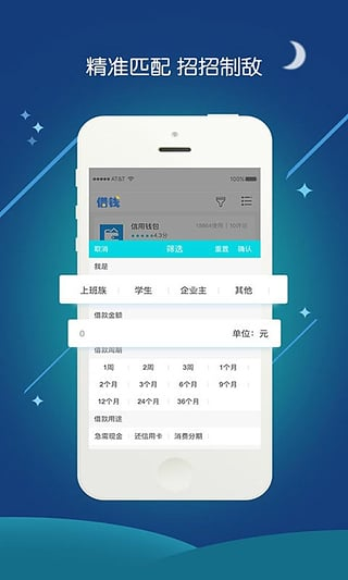 精准匹配,招招制敌不用纠结,不用搜索,简简单单,轻松搞定一切借款贷款的烦恼。输入基本信息,把标签全部点亮的借款用户能够享受到我们强力推出的自动匹配功能,保证符合你的品味。我们会在你需要时智能推测你的需求,给予你称心的借款建议,解放你的生活,陪你度过每一个开心的日子。
