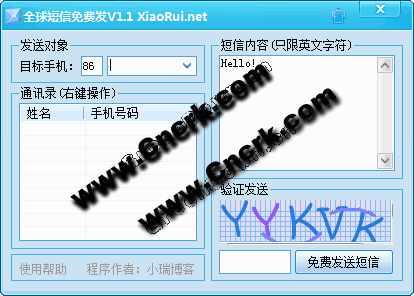 全球短信免费发 V1.53 简体中文绿色免费版 此程序利用国外免费短信网站的接口制作。优点是无需注册,无需通过对方手机验证即可给全球任意一部手机发送短信。缺点就是不支持中文。E文好的可以发E文,E文不好的可以发拼音。没有什么太大的实用价值,大家闲来无事的时候发着玩吧,全当娱乐了。