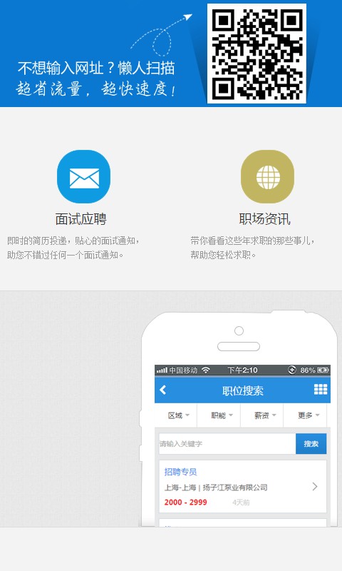 【职位搜索】海量工作机会等着您,同一时刻您将面对数以十万的工作机会;帮助您记忆最近搜索条件,简化您的搜索操作。【机型通用,极致体验】无需下载,没有平台、机型的限制,有触屏手机就能上网找工作!机会不再稍纵即逝,它已在你轻盈的指尖上!
