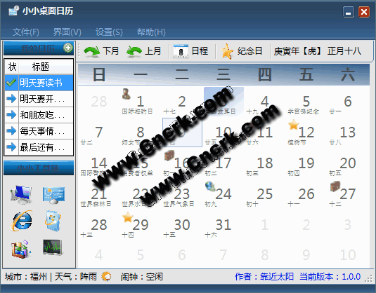 小小桌面日历是一款免费,绿色,小巧,快速的桌面日历软件。 包括日历农历显示,日程安排提醒,纪念日添加管理,天气预报等功能, 同时她还具有一个仿Vista的桌面侧边栏,美观而且简洁...