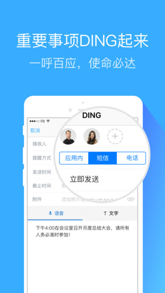 DING信息必达:重要的事可以发送语音/文字DING,通过电话或短信100%送达;