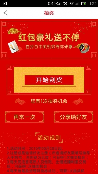 5、活动期间,抽奖红包不断,每天首笔投资、借贷、推荐好友成功奖励红包;