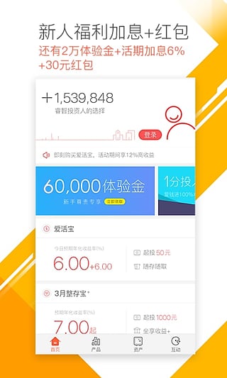 三重福利——新用户可在APP首页轮播图中领取6W元体验金。(体验金红包可用于购买任意整存宝理财产品)