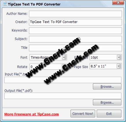 TipCase Text To PDF Converter V1.0 英文绿色免费版 TipCase Text To PDF Converter是一款有用的PDF格式转换工具,方便携带。使用它您将看到的字体类型,字体大小,旋转和页面大小设置,还可以添加到PDF文档的作者姓名,创作者,关键字,主题和标题信息