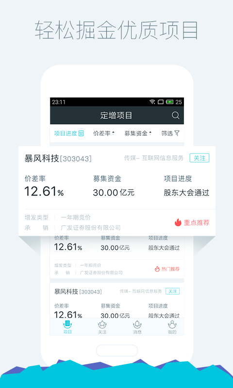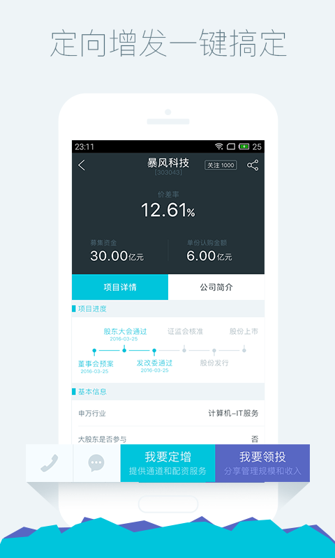 轻松掘金优质项目:原广发资管专业投研团队,投资标的深度研究,筛选优质项目。定向增发一键搞定:拼份、领投、配资、通道服务、质押融资、限售股转让。