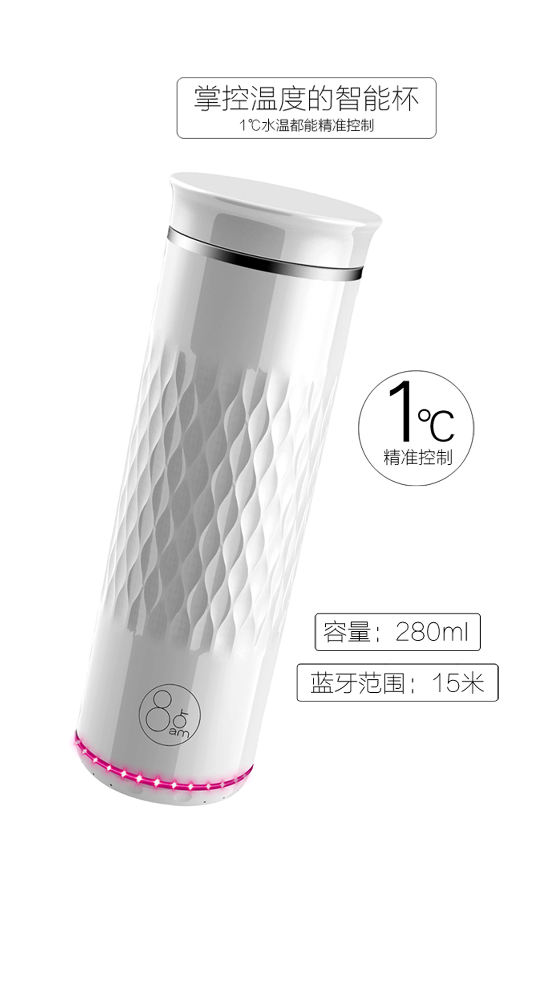 8点智能恒温水杯,一款真正意义上的智能控温水杯:1、恒定健康水温:通过蓝牙4.0连接手机APP,可根据每个人的体质定制理想的温度,永久恒定在此温度上。