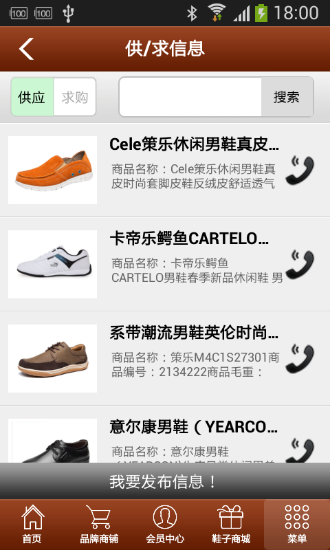 【品牌商铺】:本应用专门为用户提供各商铺信息咨询的平台,用户可以快捷地从这里了解商铺。【供/求信息】:本应用利用列表的形式清晰的展示出各种产品的供求讯息。