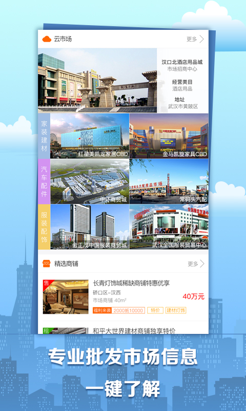 提供专业市场前端推广展示的APP及PC端,后端管理输出,支持更适合专业市场的管理系统平台,规范市场管理及规范可控的物业流转。通过撮合仓储、碎片仓储的资源整合及自建适合批发市场特性电商仓储,解决商户仓储“难”的需求。提供市场商户各类代收代缴及生活类缴费通道,提高商户生活效率。【商户】