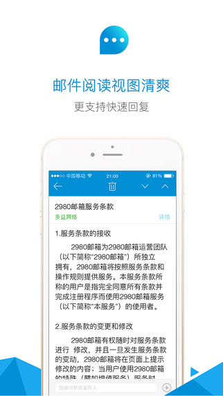 2980邮箱客户端这是来自多益旗下多益邮箱官方推出的2980邮箱客户端iPhone版,2980邮箱客户端专业、免费、安全的邮箱客户端,2980邮箱客户端一强大却又免费的手机邮箱客户端,2980邮箱客户端可以让网友们随时随地通过手机以及手势操作的方式来收发邮件,2980邮箱客户端带来更便捷的移动体验。【软件特点】