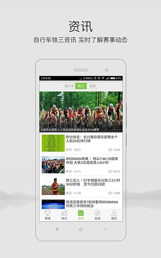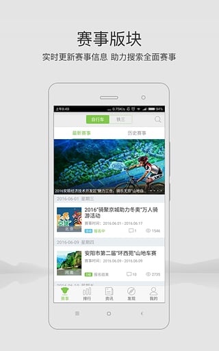 全面报道自行车、铁三赛事资讯,实时了解赛事动态。精选各大精彩赛事现场视频,足不出户,满足用户的观赛体验。