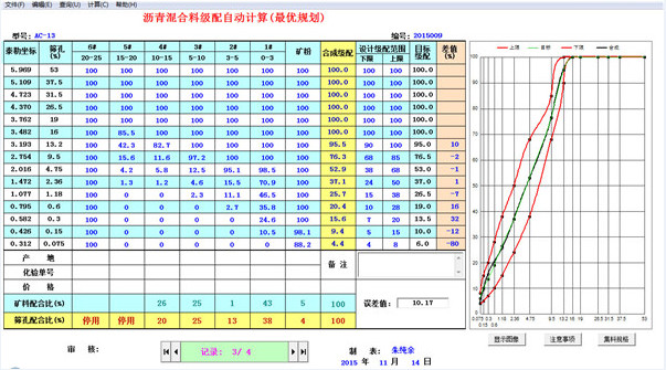 1、基本功能:沥青级配的添加计算、复制计算、修改计算和打印等。2、主要功能:矿料化验筛分结果并不是全部包含对应筛孔,而自动生产线工艺中,计量跟踪是以筛孔为依据,这就导致各种矿料配方和生产工艺对应存在偏差,