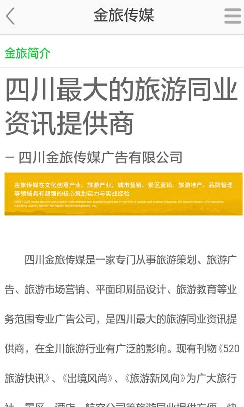 四川金旅传媒是一家专门从事旅游策划、旅游广告、旅游市场营销、平面印刷品设计、旅游教育等业务范围专业广告公司,是四川最大的旅游同业资讯提供商,在全川旅游行业有广泛的影响。现有刊物《四川金旅》广大旅行社、景区、酒店、航空公司等旅游同业提供方便、快捷的信息,辐射面涵盖全川游客,具有很大的影响力。金旅传媒与全国文化产业、旅游规划、旅游市场营销等领域资深专家共同发起成立金旅智库,是国内新锐文化旅游产业策划及营销实战机构,专注于文化与旅游产业,提供项目全程策划及管理服务。