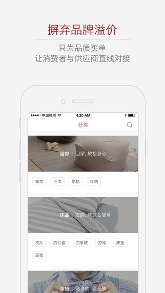 深入MUJI、膳魔师、内野、双立人等国际知名生活用品代工厂,从源头把控,所有供应商都至少符合:中国CCC认证,英国UL认证、欧洲CE认证、德国GS认证。生产商品使用和品牌商完全一致的原料、设备、工艺、技术,保证物超所值深入食材原产地核心,挑选最原始优质的天然食材,传统手工工艺,纯粹无添加,所有产品确保天然原材料,甲醛含量控制最低无害,拒绝荧光增白剂,母婴产品保证国家A级标准,让消费者放心使用,建立纵向价格体系,售价遵循“成本+增值税+邮费”,摒弃传统品牌商因品牌溢价、经销商等增值费用,让消费者只为品质买单。