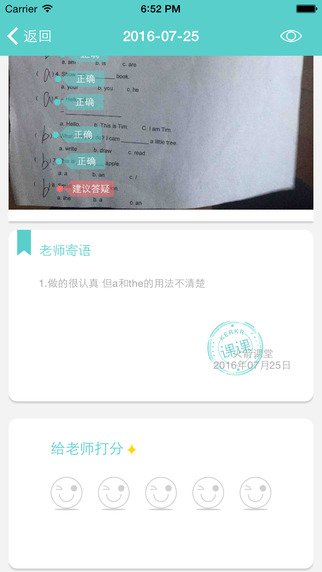 上传作业:学生写完作业后,家长用火箭课堂软件将当天的作业按科目一次性拍照并上传;作业日报:老师批改完成后学生收到当天的作业批改详情,点击首页的信封按钮查看,当天问题当天清,引导孩子与老师沟通,让学习更加轻松;