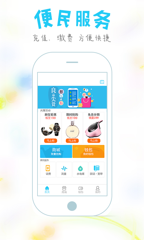1.促销、特价活动多多,捡便宜SOEASY!2.水,电,煤气,话费,流量,游戏,充值;