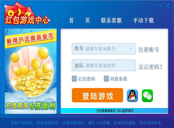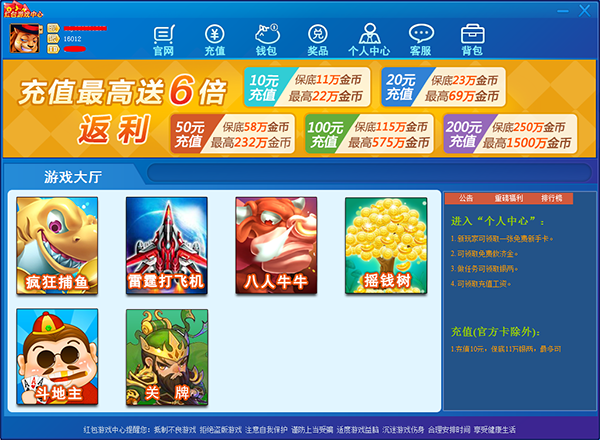 红包游戏中心是一款基于PC端的超级好玩休闲竞技类游戏平台,致力打造一个全网最好的线上电玩厅,主打多款游戏,目前包含我们已熟知的疯狂捕鱼、雷霆打飞机、八人牛牛、摇钱树、斗地主等多款游戏。该平台的游戏操作方便快捷,场景画面质量高端极致,让人感到乐趣无限。玩家只要下载注册体验就有数万金币相送,而且游戏红包奖品多多,还等什么,玩捕鱼抢红包,赶紧前来体验吧!