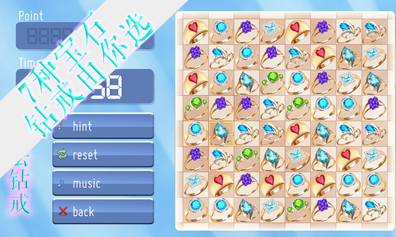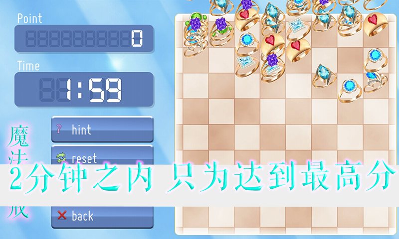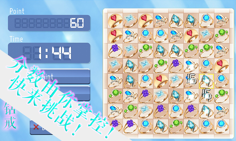 魔法钻戒是一款休闲益智类消除游戏,游戏操作简单,画面精致清新,玩法简单,如果你觉得不错,可以分享给你的姐妹们体验下,还在等什么?一起来挑战吧!魔法钻戒是一款简单休闲的钻戒消除游戏,玩法轻松简单,易于操作,画面精致清新,是你居家旅行,消磨时光的不错选择,玩家的目的就是要在2分钟之内通过消除7种精致钻戒,达到更高的分数,来成就自己心目中的梦幻体验。