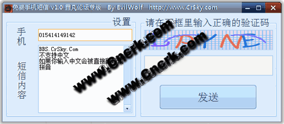 此程序利用国外免费短信网站的接口制作。优点是无需注册,无需通过对方手机验证即可给全球任意一部手机发送短信。