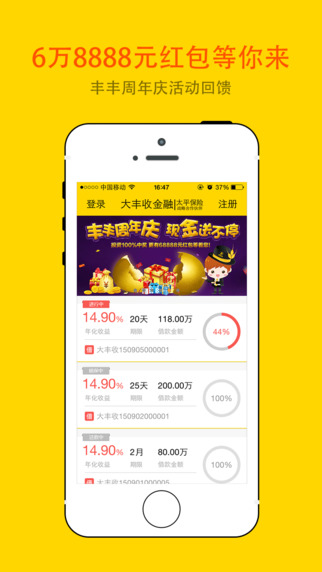 5、常规三重本息保障措施:实力雄厚的担保机构进行担保、专业第三方债权收购公司进行债权收购、大丰收金融风险保证金进行代偿。