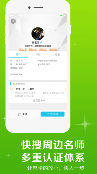 【老师赞】:老师经过严格的资质验证,更有911、112重点在校大学生注入,摆脱死板应试教育,让孩子轻松快乐学习。【花费少】:师生直接牵手,商榷课程费用,省去中间环节,家长少支出。