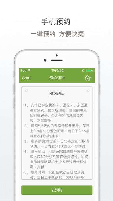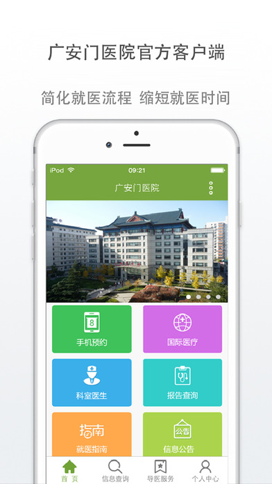 【手机预约】提供本院所有科室专家门诊和普通门诊的预约,患者只需一部手机,即可完成预约。【报告查询】患者可以通过客户端轻松查阅检验检查报告单,免去了往返医院带来的不必要的麻烦。