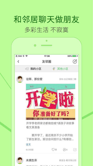 邻里社交:邻里通公众平台,邻里交流,友邻活动,友邻圈,邻里社交轻松搞定。