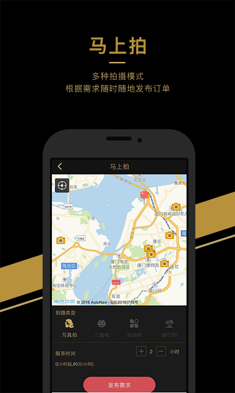 马上拍是基于LBS定位,用户发布摄影需求后,平台将会向附近摄影师发送订单,摄影师在接单后在最短的时间内赶到用户指定地址为用户提供摄影服务;