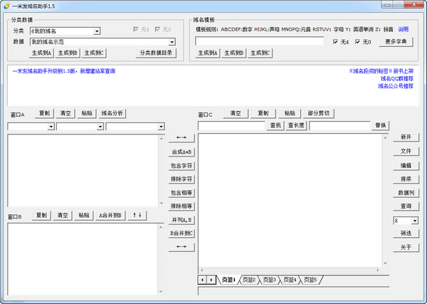 一米发域名助手独创了域名模板定义:ABCDEF:数字HIJKL:声母MNOPQ:元音RSTUV:字母Y:英语单词Z:拼音,大写字母代表某类数据,小写及数字保持不变生成域名数据,并提供以下数据字典:2-6位豹子,3-6位顺子,城市全拼,城市简拼,大省会头,常用拼音,常用英文单词,水果蔬菜,电话区号,省份简拼,英文动词,英文名词,英文形容词,行业简拼,超级城市,邮编等,用户还可以自己添加数据字典,是域名批量注册的好助手。