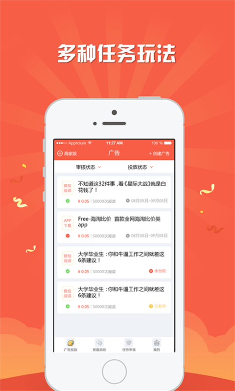1、多种任务玩法。我们有最全面的营销推广玩法,包括但不限于广告投放、P2P激活、微信推广、品牌曝光等。2、商务渠道多元。我们与业内各大品牌渠道商保持良好互动关系,你想认识的我牵线!
