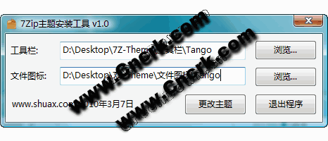 7Zip主题安装工具 V1.0 简体中文绿色免费版 网上有个主题管理器的汉化版,然而不支持64位系统。所以就自己动手写了个小程序。支持64位系统中的7-Zip。在替换完成后会提示是否刷新缓存,支持win7。因为没有预览界面,所以我去掉了原版的部分信息,另外在新版7-Zip中还多了四个文件图标,但是为了保证兼容性,我并没有添加。