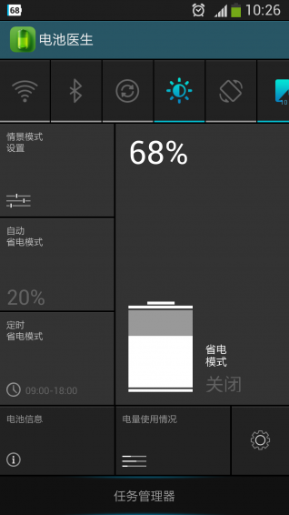 自定义省电情景模式:关闭Wi-Fi/蓝牙/自动同步/动画效果/自动旋转屏幕/触感反馈、调整屏幕亮度、调整屏幕休眠超时活动应用和进程管理器(类似于三星自带的任务管理器)