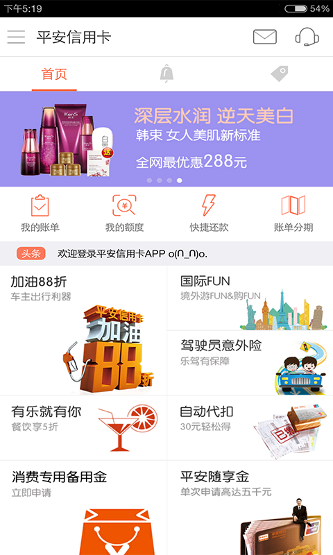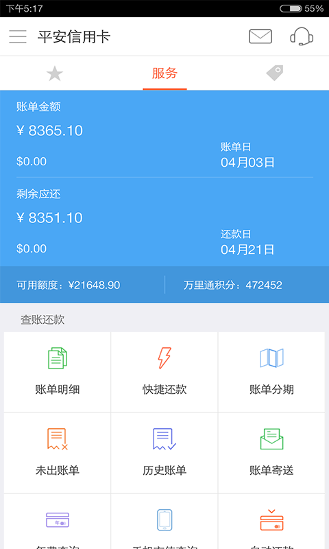 信用卡基础功能:查账还款、账单分期、额度管理、灵用金、消费专用备用金专属活动:加油88折等常态互动,平安买单等季节性活动