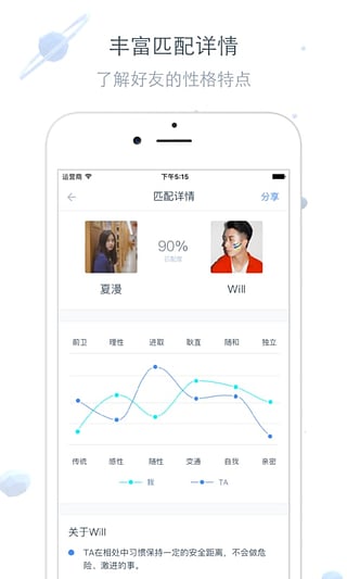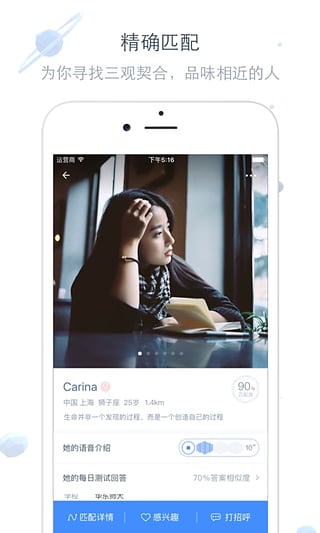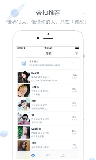 如故app是一款为你寻找soulmate的手机应用。如故app通过众多社会心理学家研究打造的K-TES测试、最优匹配算法、以及更多有趣的题目能让用户进行更深层次的精神交流,找到和自己三观契合,品味相近的朋友。你一个人吃饭旅行,到处走走停停,也一个人看书写信,自己对话谈心。