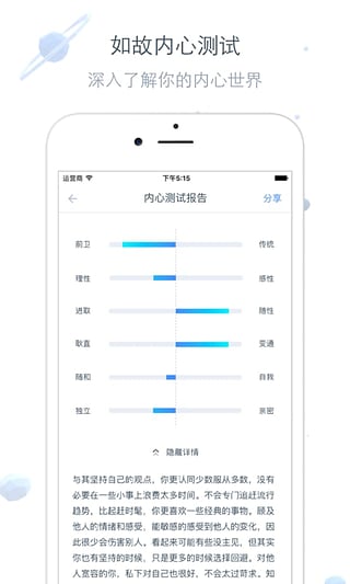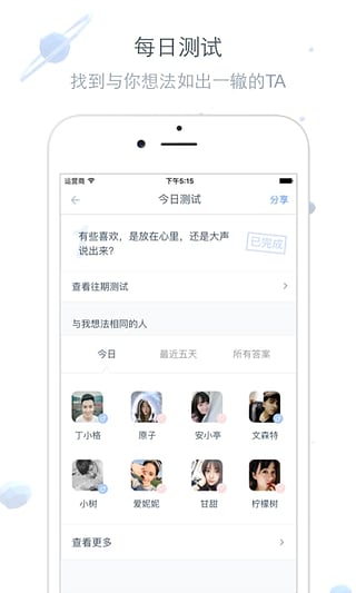 1.在「我的内心测试」单元,你可以找到我们新增的「拓展测试包」,完成更多内心测试,匹配结果也会更准确哦;2.现在,完成「今日测试」后,不仅可以看到与你意见相同的人,还可以看到所有人答题的统计结果;