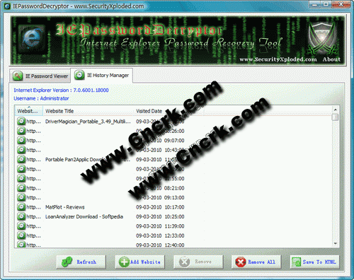 它还配备了独特的特性,它允许用户重置IE的分级审查密码,如果用户已失去了它。同时还介绍,IE浏览器历史记录管理器的接口,不仅显示了详细的IE浏览器历史的内容,还提供了选择添加/删除轻松的网站。